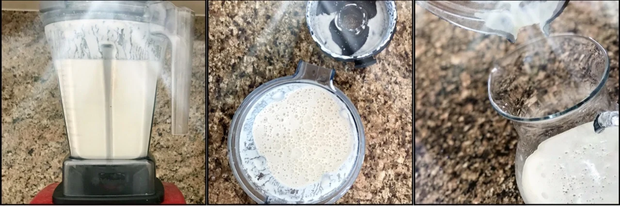 Soak cashews in very hot water for at least 15 min (or up to 1 hour). Drain the water using a collander and rinse off with clean water. Transfer cashews to a Vitamix or high-powered blender. Add 4 cups of filtered water. Blend on high for about a minute or until all the cashews have dissolved into a cashew milk.